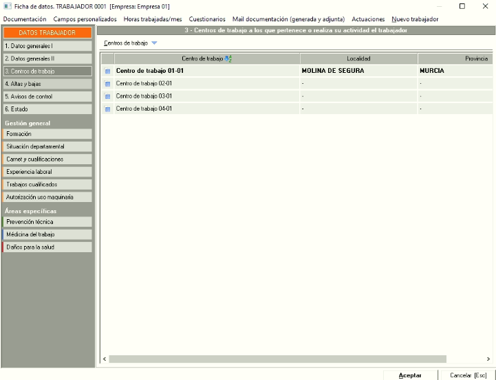En esta pestaña estableceremos, desde el desplegable "Centros de trabajo", los centros de trabajo a los que pertenece el trabajador.