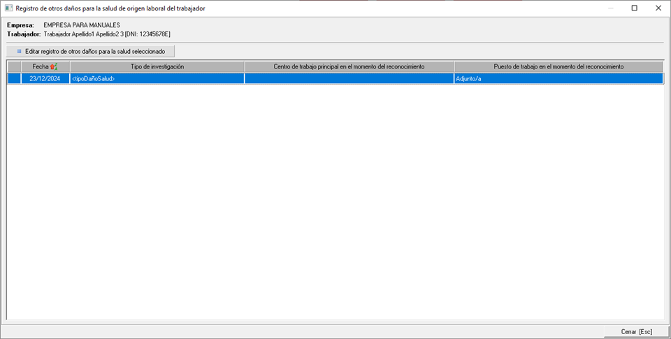 El enlace da acceso al listado de registros de otros daños para la salud asociados al trabajador, que pueden ser editados con el botón Editar registros de otros daños para la salud seleccionado.