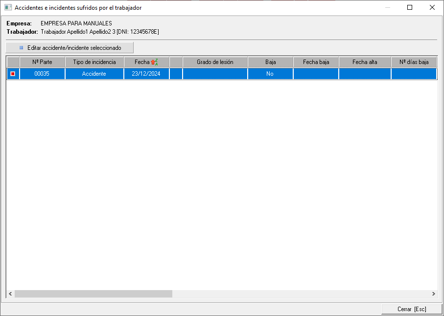 El enlace da acceso al listado de accidentes, e incidentes, registrados al trabajador, que pueden ser editados con el botón Editar accidente/incidente seleccionado.
