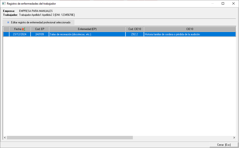 El enlace da acceso al listado de enfermedades profesionales registradas al trabajador, que pueden ser editados con el botón Editar registro de enfermedad profesional seleccionado.