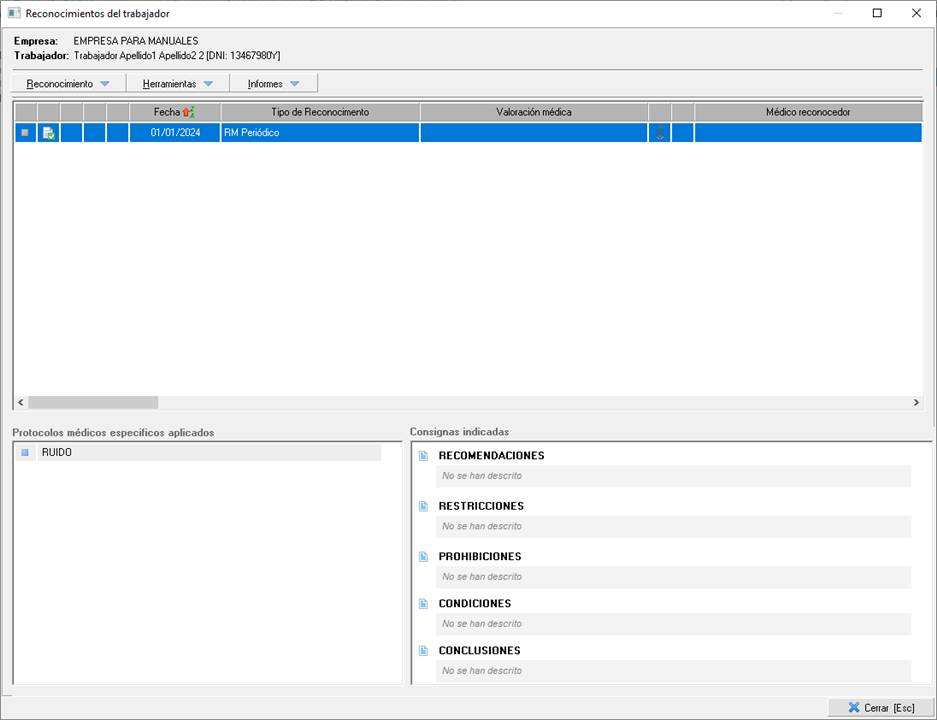 El enlace da acceso al listado de reconocimientos, realizados o no, del trabajador dentro de la empresa actual y al seleccionar cualquiera de ellos muestra información de los protocolos y consignas asociados a los mismos. Además permite diversas acciones desde los distintos menús: