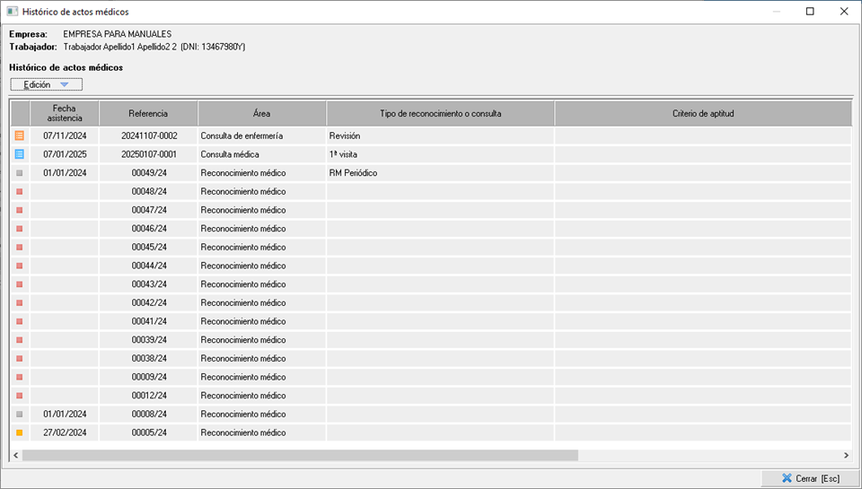 El enlace da acceso al listado de consultas médicas y de enfermería realizadas al trabajador y desde los menús permite: