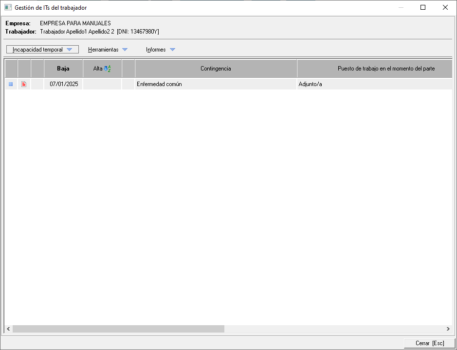 El enlace da acceso al listado para gestionar las ITs del trabajador, donde el menú Incapacidad temporal permite crear nuevos registros, modificar el registro seleccionado y eliminar, Herramientas permite cambiar el puesto de trabajo y centro del trabajador, además de marcar/desmarcar la IT como comunicada a DELTA e Informes generar el parte de IT o un Word con el listado de pantalla.
