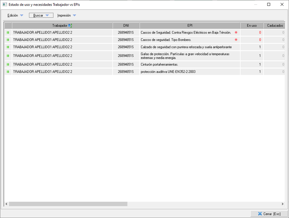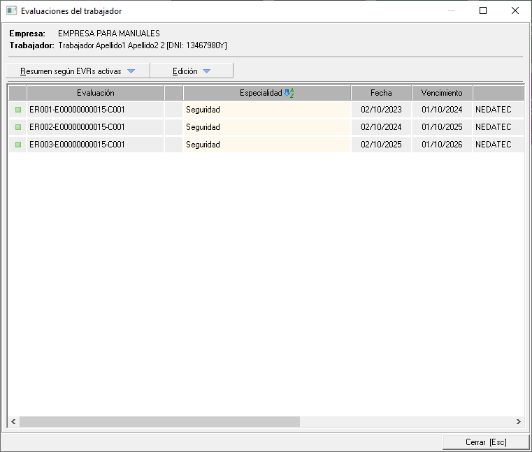 - Resumen según EVRs activas permite listar los riesgos, EPIs, formación e información que afectan al trabajador por las relaciones que tiene con los elementos evaluados.