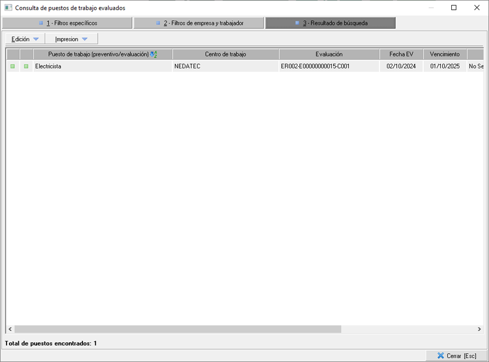 - Edición permite acceder a la ficha del puesto en la EVR, a la EVR o el centro de trabajo propietario de la EVR.