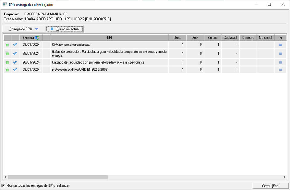 El botón Situación actual abre este formulario que muestra el estado de uso y necesidades de los trabajadores, que lista los EPIs entregados al trabajador y los que necesita por sus riesgos asociados. El menú Edición permite realizar nuevas entregas manuales, entregas de los EPIs seleccionados, devoluciones o ver las entregas realizadas del EPI seleccionado.