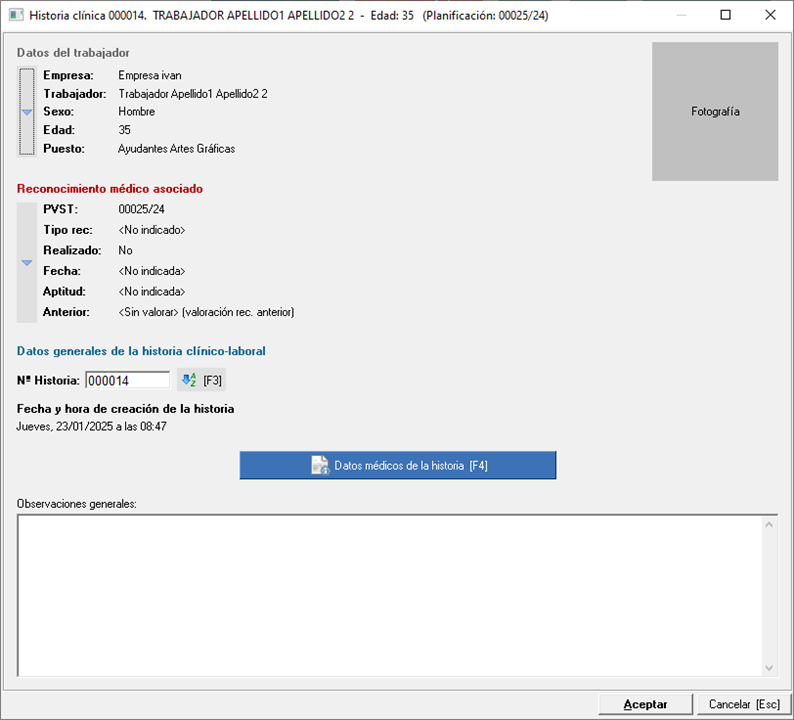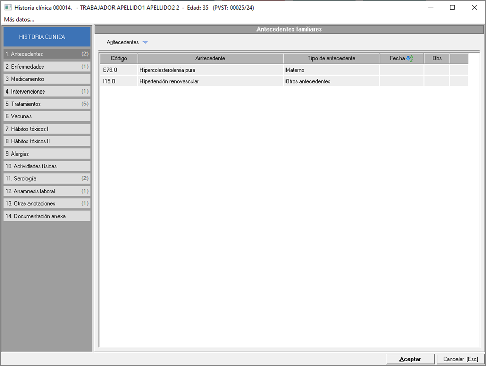 El botón Datos médicos de la historia [F4] nos lleva a este formulario con los datos médicos propios de la historia clínica del trabajador.