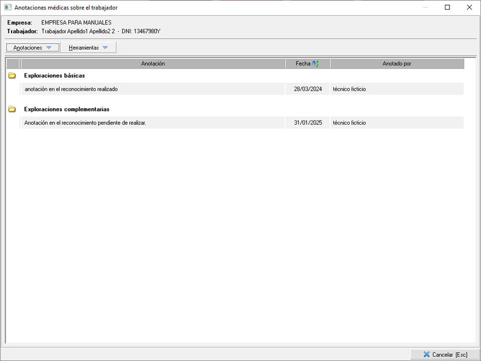 Lista las anotaciones médicas realizadas en los reconocimientos médicos o consultas médicas/enfermería, donde el menú Anotaciones permite crear nuevos registros, modificar el registro seleccionado y eliminar y Herramientas permite cambiar datos en los registros seleccionados.