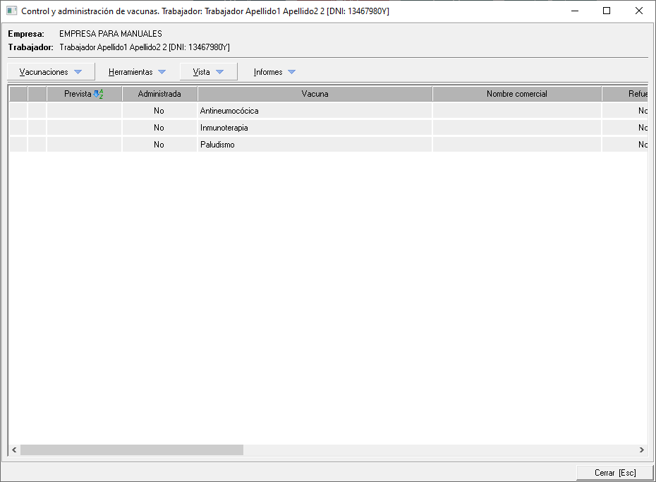Muestra el listado de vacunas aplicadas al trabajador y permite diversas acciones desde los distintos menús: