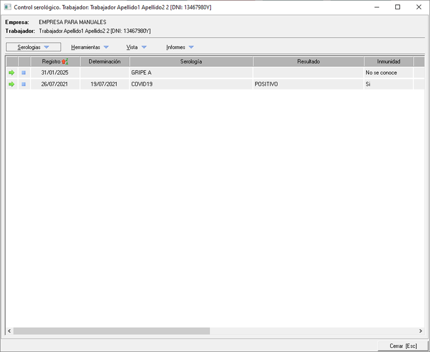 Muestra el listado de serologías realizadas al trabajador y permite diversas acciones desde los distintos menús:
