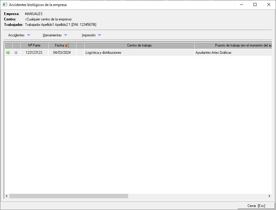 Muestra el listado de accidentes biológicos que afectan al trabajador, donde el menú Accidentes permite crear nuevos registros, modificar el registro seleccionado y eliminar, Herramientas permite abrir/cerrar la edición del registro y cambiar el responsable del mismo e Informes generar el parte del accidente seleccionado o un Word con el listado de pantalla.
