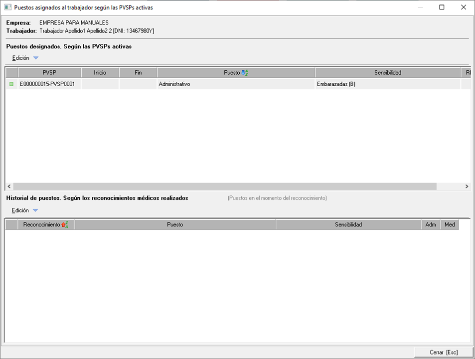 Este formulario muestra información de los puestos de trabajo de las PVSPs asociados al trabajador y el histórico de puestos según los reconocimientos médicos realizados.