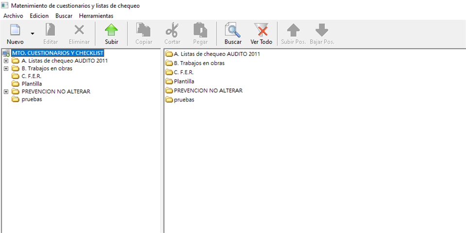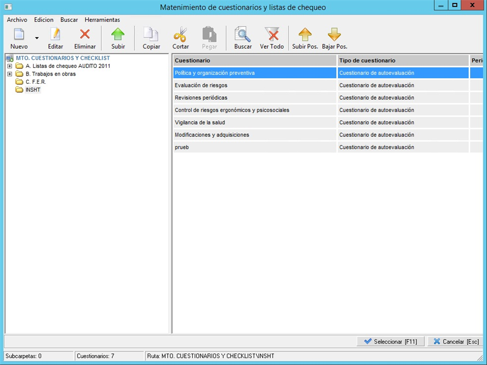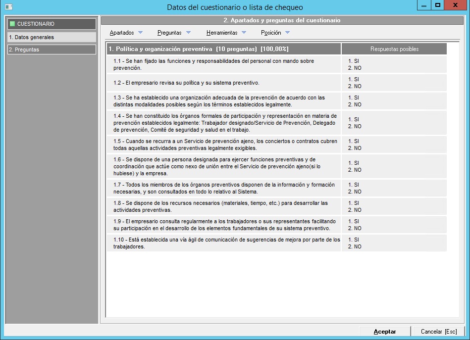 Una vez comentados los mantenimientos que tendremos disponibles para configurar los cuestionarios, pasamos a ver con más detalle el mantenimiento general de estas listas de chequeo.