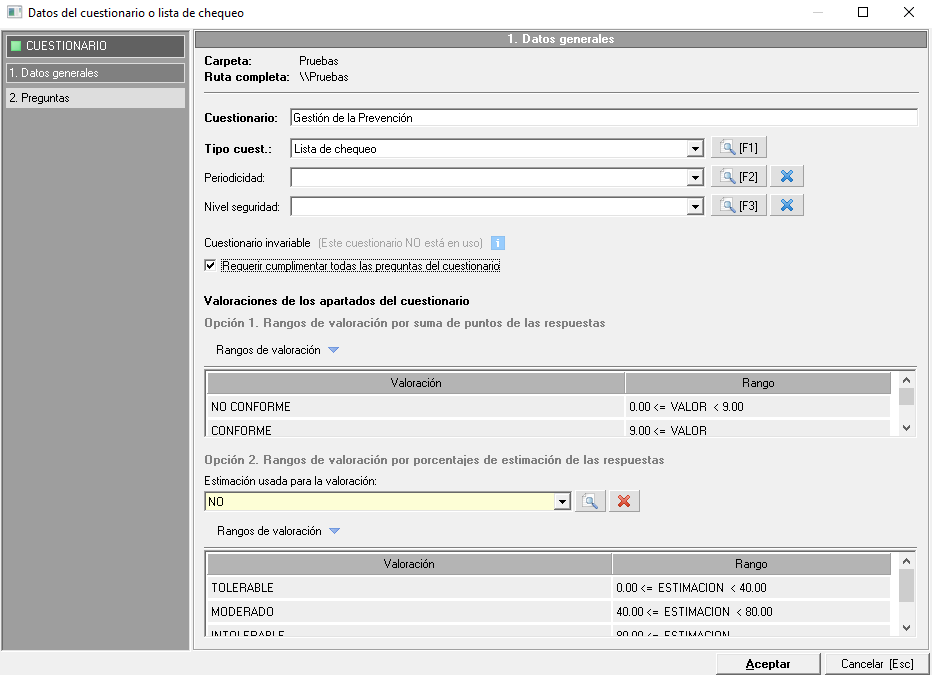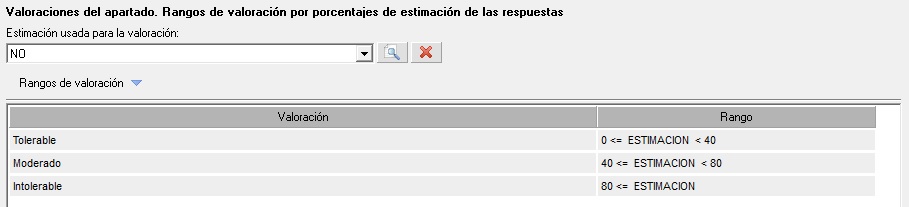 A continuación se calculará la valoración final del cuestionario, la cuál se obtendrá comparando el porcentaje de respuestas de la estimación seleccionada en el campo 'Estimación usada para la valoración', con los rangos definidos. En este caso no se tiene en cuenta el peso de cada apartado.