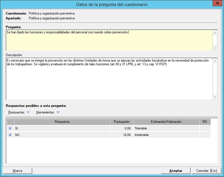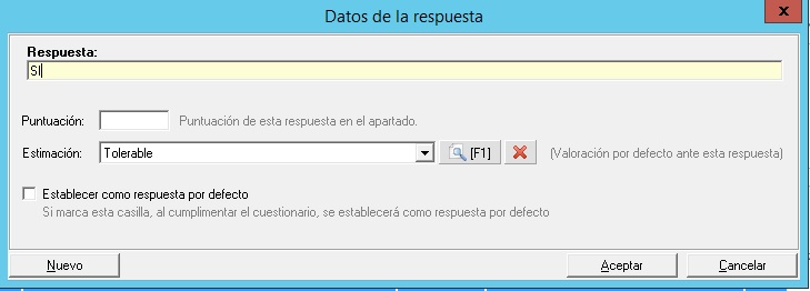En cada respuesta puede marcar una respuesta por defecto, esto sirve para cuando se aplica un cuestionario a un elemento, tiene una herramienta para responder todo el cuestionario con las respuestas marcadas por defecto.