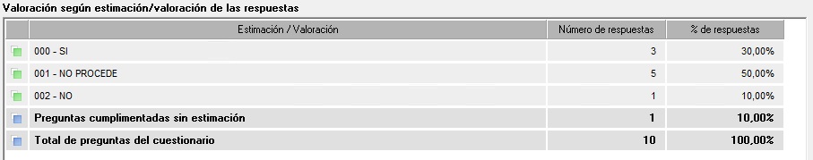 - Valoración por porcentajes de estimación de respuestas. A las respuestas de cada pregunta se les asignará una estimación. Al cumplimentar el cuestionario, se ofrecerá el resultado del porcentaje de respuestas de cada estimación.
