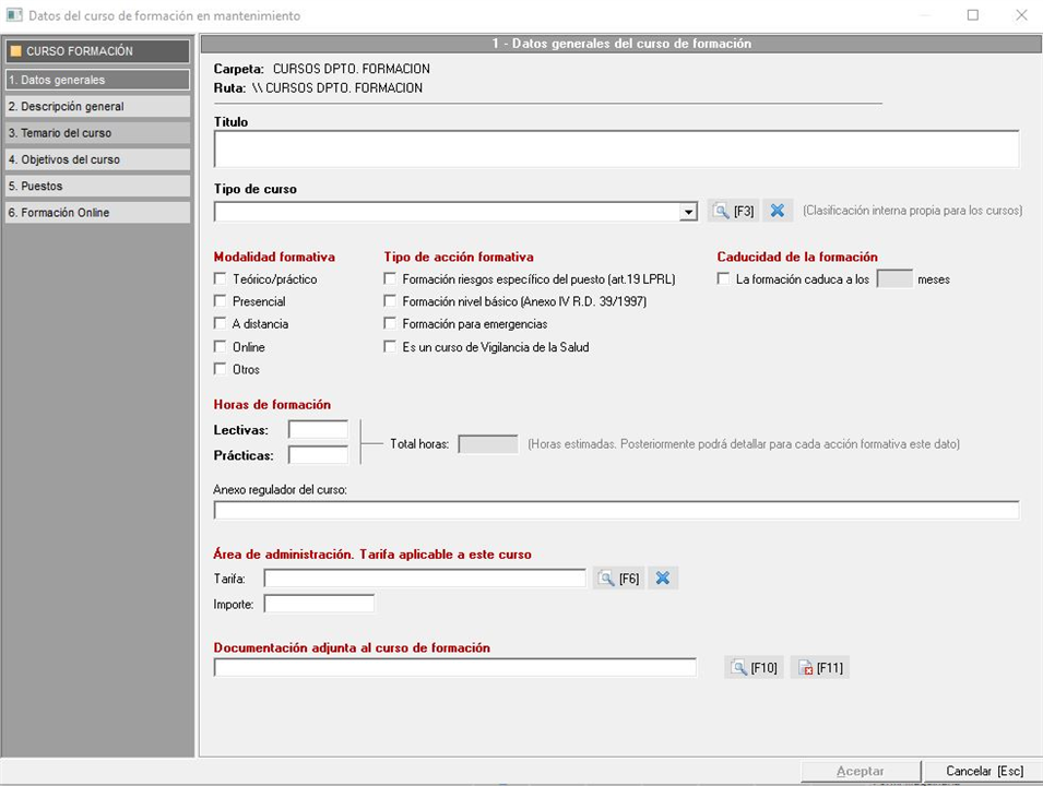 Para ello dispone del menú Mantenimientos > Cursos de formación en el módulo GEST . Este menú también está disponible en el módulo ADM y desde el módulo TEC ha de usar Mantenimientos > Prevención técnica > Elementos de evaluación > Formación.