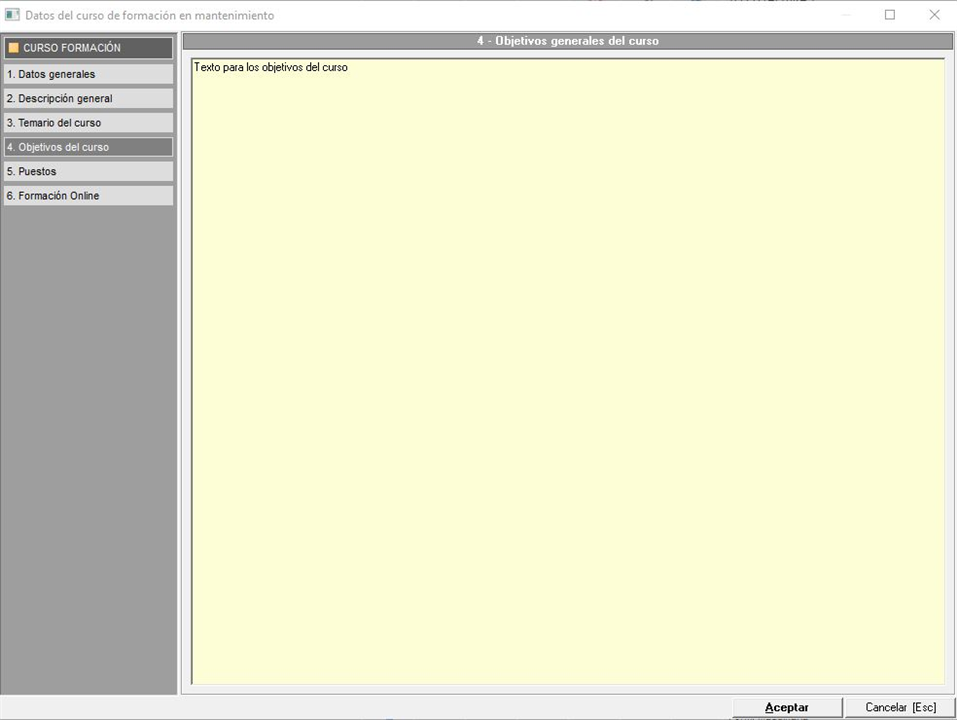 - Tipo de curso. Campo con el que podemos clasificar los cursos por tipo, el cuál es editable desde un mantenimiento.