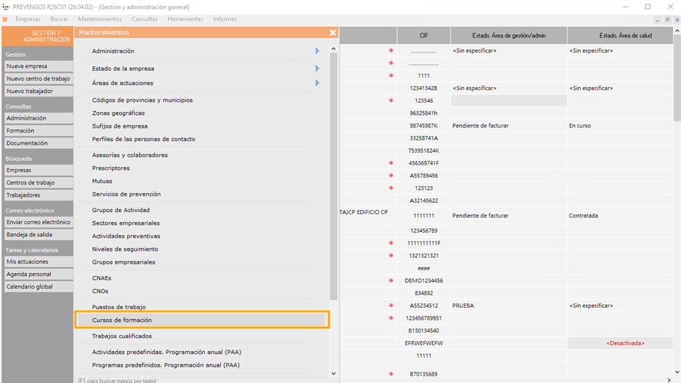 Prevengos permite registrar las formaciones realizadas a los clientes. Para ello, es necesario que los cursos estén previamente configurados en el sistema.