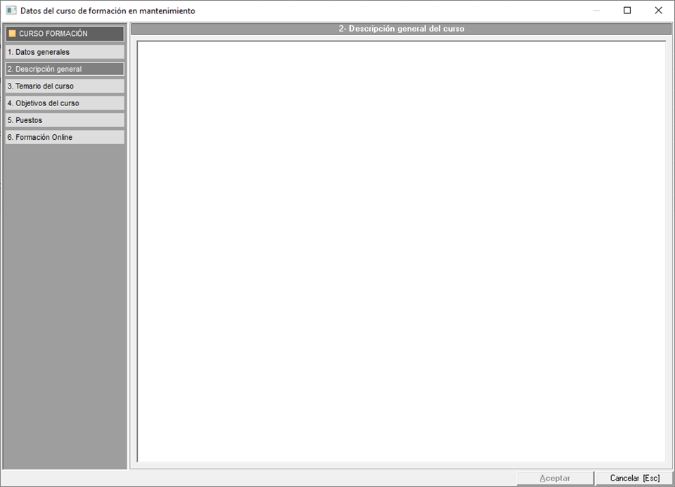Esta pestaña ofrece un campo de texto libre, para redactar una descripción sobre la acción formativa.