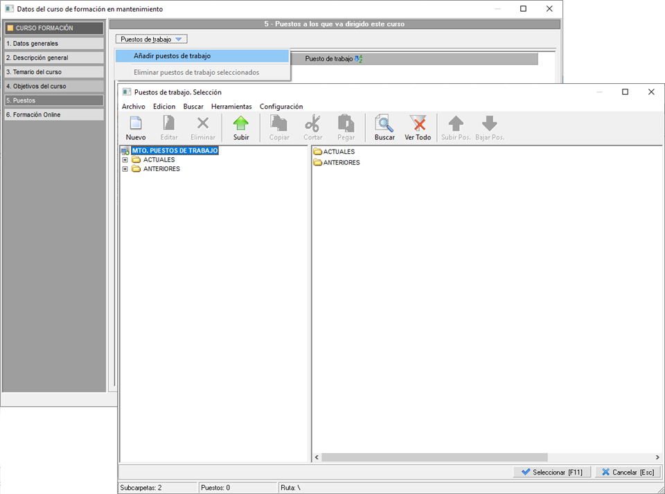 Este apartado permite añadir los puestos de trabajo, desde el mantenimiento de puestos de trabajo, que se tendrán en cuenta para incorporar a los trabajadores en el curso cuando esté asociado a la empresa.