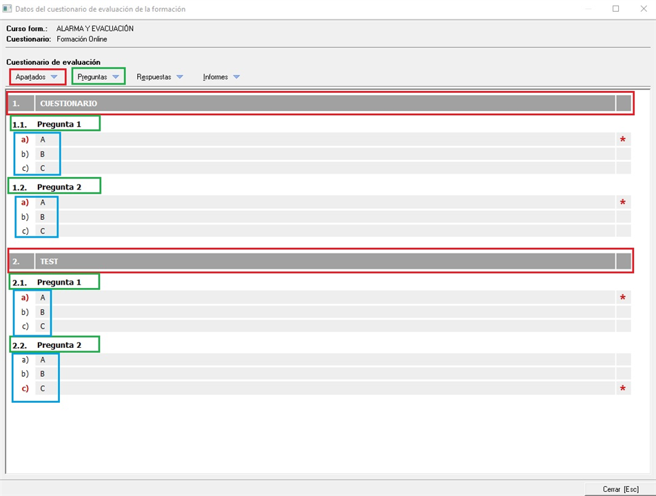 Vemos 3 partes claramente diferenciadas. Por un lado, tenemos los apartados, los cuales gestionamos desde el desplegable con el mismo nombre donde podemos crear, editar, eliminar y modificar la posición en el cuestionario.