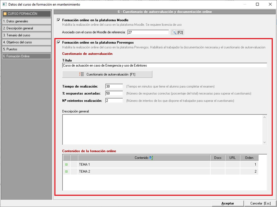 Como pudimos ver en el manual sobre el mantenimiento de cursos de formación, dentro de la ficha del propio curso tenemos una pestaña orientada a la parte Online. Esta configuración se determina en el punto “6. Formación Online” donde podemos configurar el acceso a la parte online del curso, así como el cuestionario que el trabajador puede realizar.