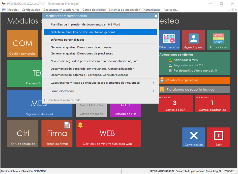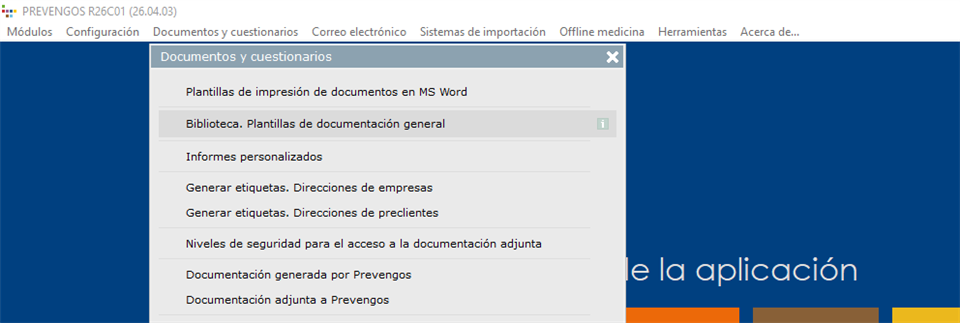 Como hemos comentado anteriormente, esta herramienta está disponible en varios módulos de Prevengos, desde donde podemos tanto acceder al mantenimiento de la biblioteca como generar los documentos.