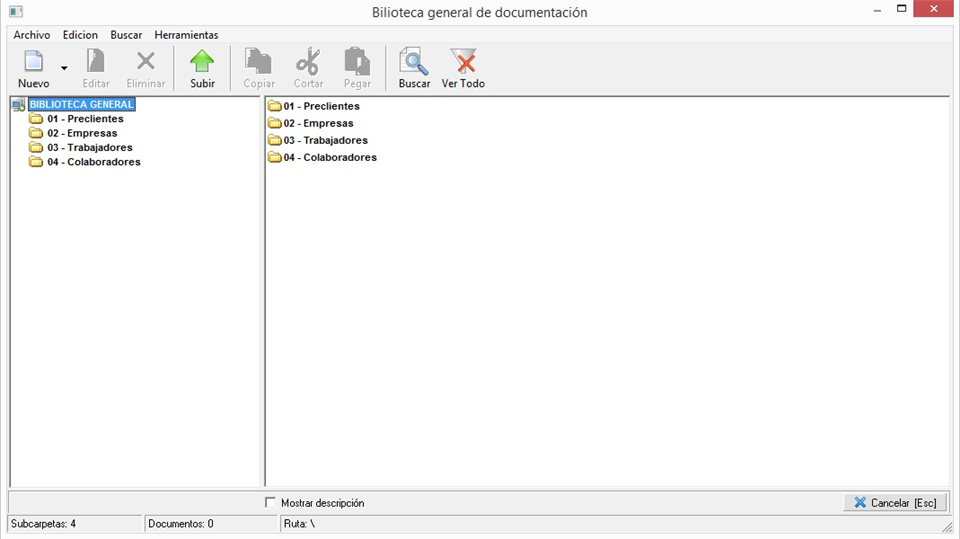 En todos estos módulos dispondremos del acceso al mantenimiento desde el menú superior [Herramientas] seleccionando la opción Biblioteca documental (En algunos módulos aparece como Biblioteca de documentación general). Una vez accedamos al mantenimiento veremos la siguiente pantalla:
