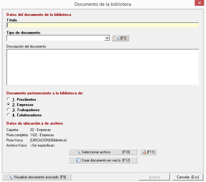 Como vemos en la imagen superior, desde Biblioteca documental accedemos al mantenimiento y desde Generar documento de la biblioteca seleccionamos a que elemento se lo vamos a generar. La única variante la tenemos en el módulo de gestión comercial donde la única opción serán los preclientes. La elección que hagamos será el filtro que tengamos a la hora de añadir empresas, trabajadores o colaboradores. Una vez seleccionado veremos la siguiente pantalla: