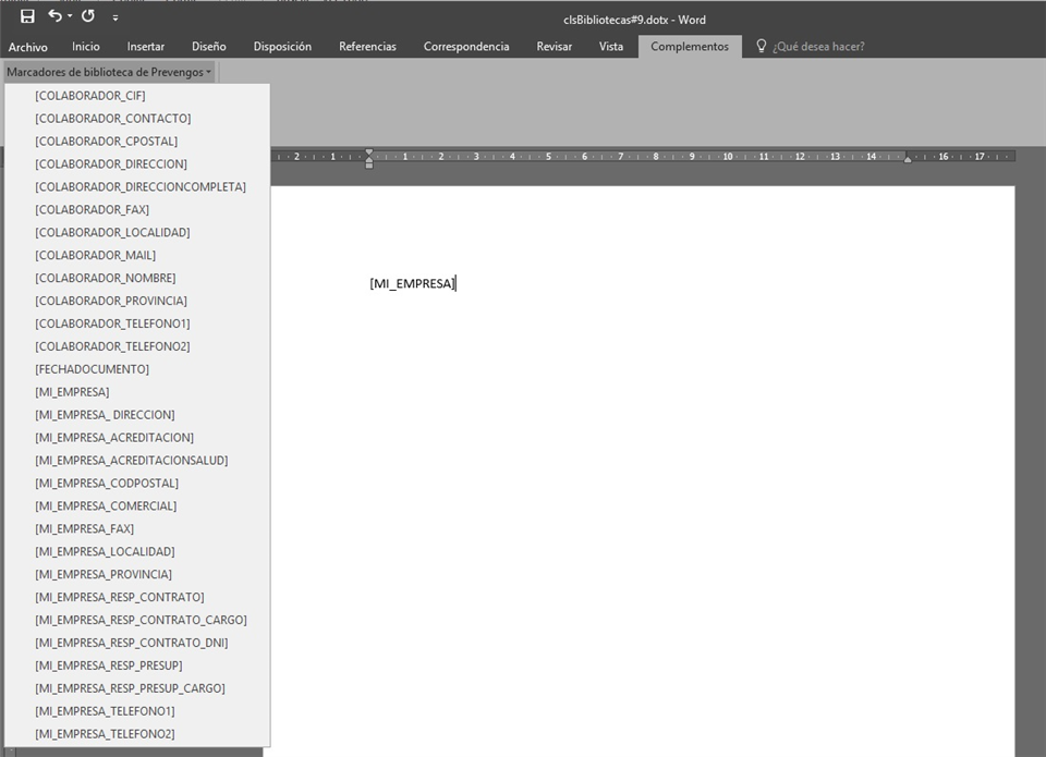 nos creará un documento de Word en blanco con los marcadores disponibles en función de la selección previa. Sobre este documento podemos crear el escrito que queramos usando los marcadores disponibles en la herramienta "Complementos" de Word - Con el botón