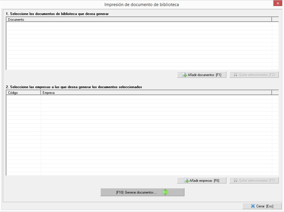 - En la parte 1. Seleccione los documentos de biblioteca que desea generar podemos, como bien dice el título, añadir uno o varios documentos de la biblioteca para que sean generados de manera masiva. Bastará con usar el botón [Añadir Documentos] para abrir el mantenimiento de la biblioteca y elegir los documentos que deseemos.