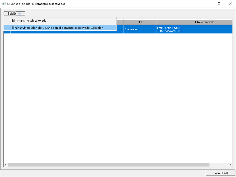 Esta herramienta abre el formulario que se muestra a continuación, donde tiene que seleccionar los registros correspondientes para usar el menú Edición > Eliminar vinculación del usuario con el elemento desactivado. Selección.