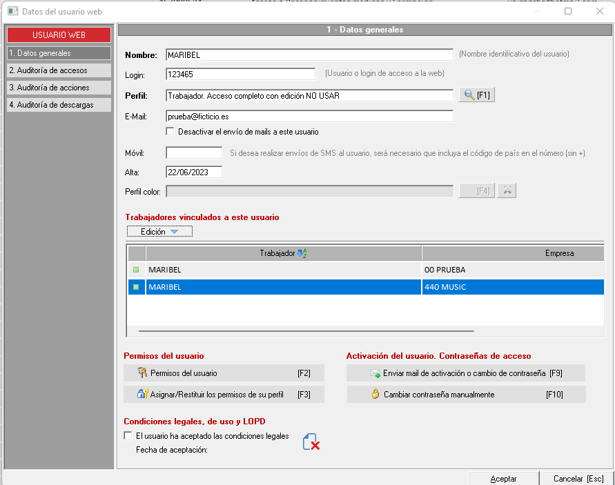 Para poder entender este proceso tenemos que tener claro el concepto 'usuario web' y 'asociaciones'. Lo más común es que un usuario web acceda a un solo elemento, sin embargo, puede ocurrir que acceda a varios. Por ejemplo, en la siguiente captura tenemos un usuario web asociado a dos elementos (trabajadores), ya que el trabajador está dado de alta en dos empresas distintas.