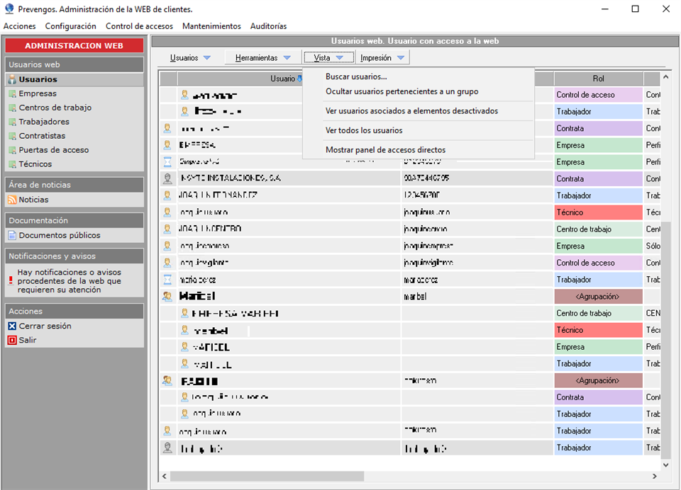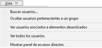 Para localizar aquellos usuarios que están asociados a elementos (trabajadores, empresas, contratas...) y al menos uno de ellos están desactivados, acceda al Administrador web y una vez elegido el rol que necesite, o cerrado el panel de accesos directos, utilice el menú Vista > Ver usuarios asociados a elementos desactivados