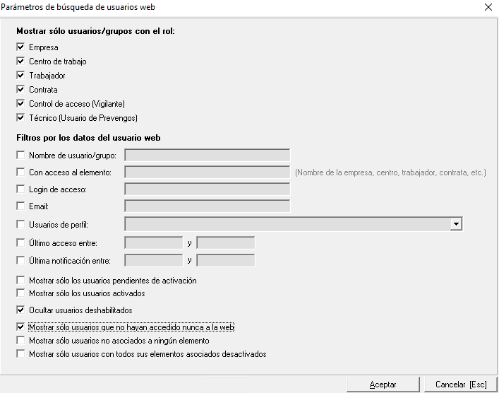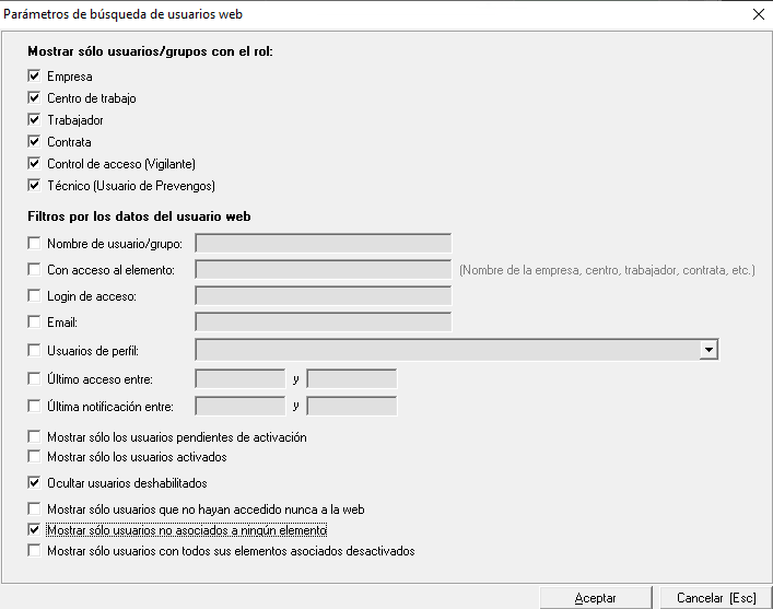 En el caso de los usuarios que se hayan creado sin asociar a ningún elemento, o que una vez creado se haya eliminado la vinculación entre el usuario web y el elemento al que accede (empresa, trabajador, contrata...), puede utilizar el buscador de usuarios web para localizarlos y, si lo desea, eliminarlos.