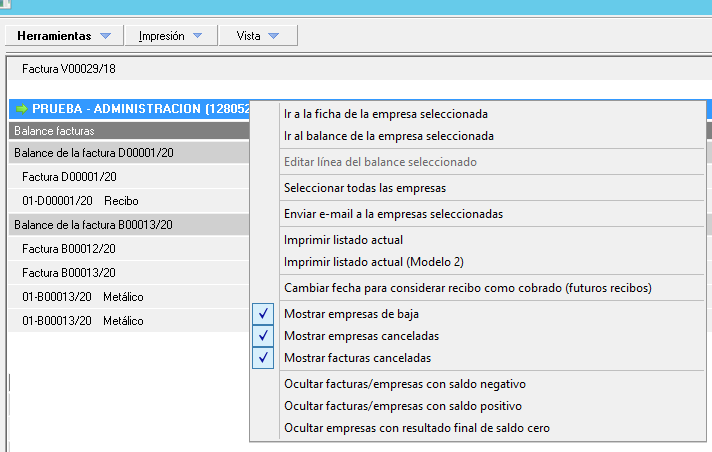 Debe tener en cuenta que vienen marcados por defecto las opciones que ve en la imagen, por lo que al desmarcar alguna de las opciones no se mostrarían. También puede acotar las empresas y facturas que se muestran en pantalla marcando las opciones siguientes.