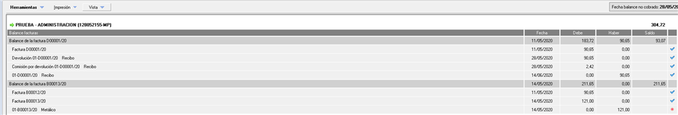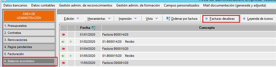 Puede acceder a la consulta de facturas deudoras dentro de la ficha del cliente, en la barra de la izquierda Área de administración->Administración->6. Balance económico.
