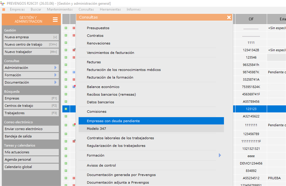 Dentro del módulo de Administración desde el menú superior > Consultas > Empresas con deuda pendiente