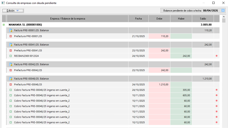 Para que esta herramienta funcione correctamente es imprescindible mantener una gestión rigurosa del balance económico, ya que los datos que muestra dependen directamente de la información registrada en él. Únicamente aparecen como deudoras aquellas empresas o facturas que cumplan dos condiciones simultáneamente: que el cobro esté pendiente de confirmación y que la fecha de vencimiento del cobro sea anterior a la fecha en que se realiza la consulta.