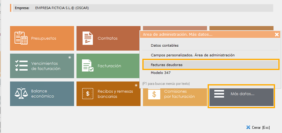 Puede acceder a la consulta de facturas deudoras dentro de la ficha de cada empresa haciendo click en la barra de la izquierda Administración > Más datos > Facturas deudoras. Aqui aparecerán todas las facturas deudoras de esa empresa en concreto.