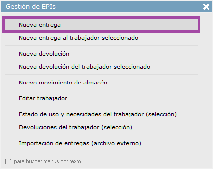 Desde el módulo de EPIs, usando el menú superior o el acceso directo del panel lateral izquierdo, podremos seleccionar "Nueva entrega".
