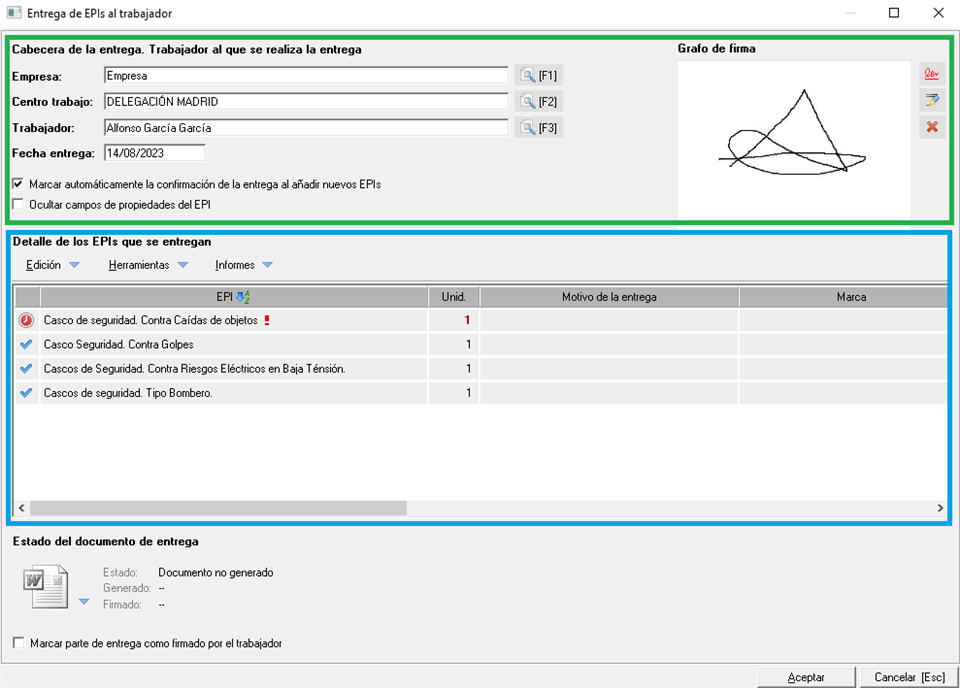 Una vez abierta la pantalla de la nueva entrega diferenciaremos la cabecera (verde), relativa a los datos del trabajador, del detalle (azul), donde indicaremos todos los EPIs de la entrega.