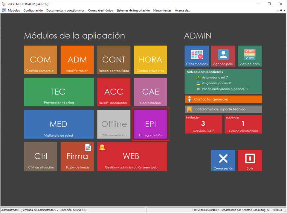 - Módulos de prevengos, desde este menú podrá cambiar de módulo. Es decir, podrá ir directamente al módulo de Administración o de Prevención Técnica, por ejemplo.