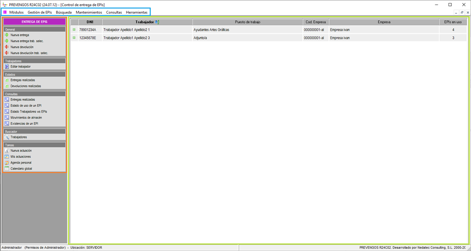 En la parte superior, destacado dentro de un cuadro azul dispone de la barra de menús desplegables, en la parte central destacado con un cuadro verde dispone del listado de trabajadores sobre los que se han registrado entregas y devolucions de EPIs y en la columna lateral izquierda destacado con un cuadro naranja dispone de accesos directos a gestión de general de EPIs, consultas, buscadores, herramientas e informes.