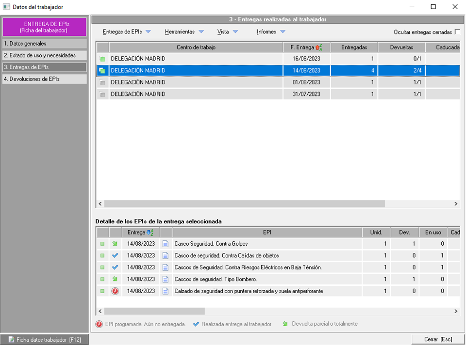 - "3. Entregas de EPIs". Desde esta pestaña podremos gestionar las entregas realizadas al trabajador, pudiendo hacer devoluciones o ver el detalle de los EPIs entregados o del estado de uso y necesidades de EPIs mediante el desplegable "Herramientas". En la parte superior se muestran los centros de trabajo sobre los que se ha realizado al menos una entrega