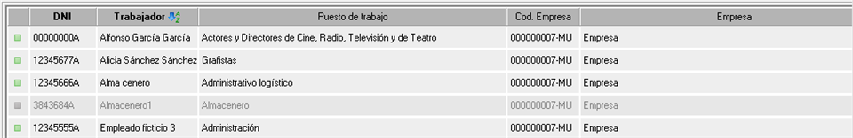 La primera columna del listado muestra si los trabajadores están o no desactivados, mientras que el resto de columnas muestra información sobre el trabajador, como su puesto de trabajo, empresa a la que pertenece o cantidad de EPIs en uso.