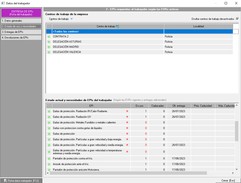 - "2. Estado de uso y necesidades". Muestra, según la selección de centro de trabajo que se haga, el estado de uso de los epis y las necesidades del trabajador. Los EPIs que necesita el trabajador según las EVRs o según su puesto de trabajo, dependiendo de qué configuración se elija, aparecerán con un asterisco rojo. Para gestionar el estado y necesidades de EPIs existe la consulta de "Estado de uso y necesidades del Trabajador".