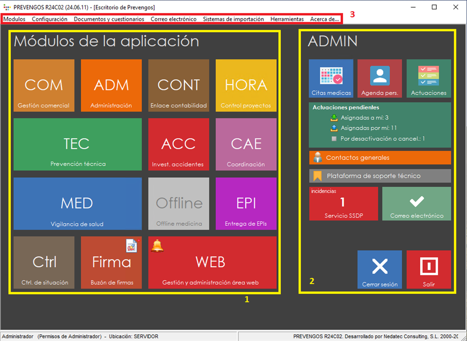 Hemos diferenciado el escritorio de Prevengos en 3 bloques, marcados y numerados para poder explicarlos en los siguientes apartados.