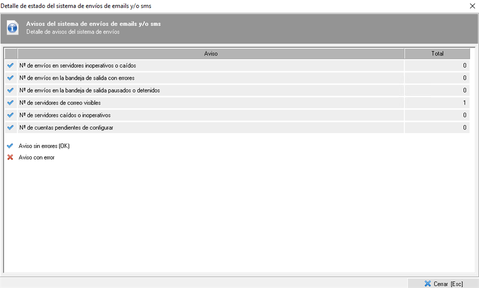 - Correo electrónico. Si existe algún error con el envío de correos electrónicos o mensajes de texto se marcará el recuadro en rojo indicando el número de errores. Si hace click, podrá ver el detalle del error para poder solucionarlo, que puede tener que ver con el envío propiamente, con el servidor, o puede que tenga alguna cuenta sin configurar.